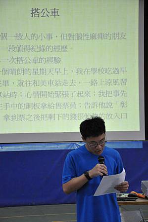 三位同學前後唸了志賢所寫的三篇文章:寫書法、搭公車、爆漿小籠包。席間不時有笑聲,這些難題,一般人眼中從來沒想過,連上公車那高高的台階,對志賢來說,都竟是如此不易達成的任務,但是他用心盡力地一一克服!主持人何厚華特別欣賞志賢對這些事情的態度,因為他每完成一件事,總是很正面的告訴自己:好!完成了!下次也要加油喔!